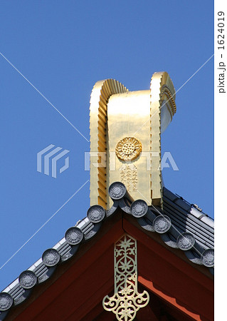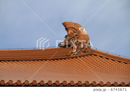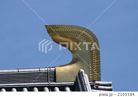 屋根の上に鯱(鬼瓦)が青空に黄金の色が映えている