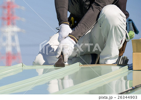 屋根工事 ガルバリウム鋼板を加工している屋根職人