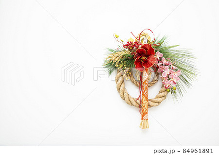 おしゃれなしめ縄飾りのある正月イメージ_紅白背景