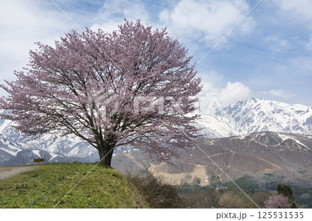 満開の野平の一本桜と残雪の白馬三山 長野県白馬村
