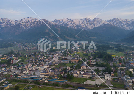 早朝の白馬連峰と新緑の白馬村 長野県白馬村(ドローンによる空撮)