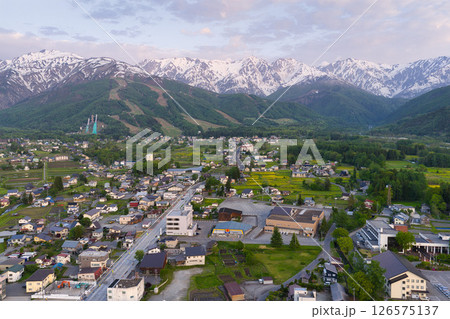 新緑の白馬 大出の街並みと残雪の白馬三山 長野県白馬村(ドローンによる空撮)