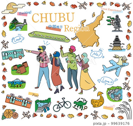 日本の中部地方の秋の名物観光を楽しむ観光客、アイコンのセット(線画)