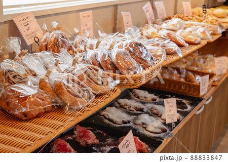 袋に包まれたパンが棚に並ぶおしゃれなベーカリー