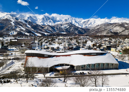 協和ウィング白馬(ウィング21)と雪煙を上げる白馬連峰 長野県白馬村(ドローンによる空撮)