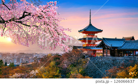 Cherry blossoms and red pagoda at sunset, Japan.