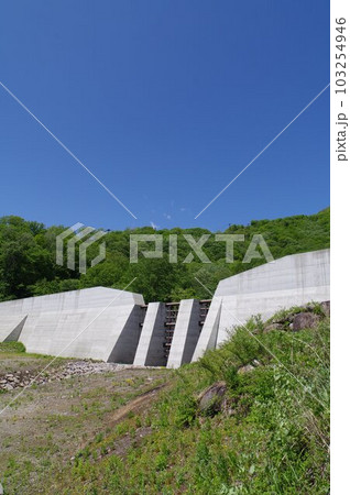 信州 小谷村の砂防施設 栂池沢3号砂防堰堤 鋼製スリット3連格子枠の大型堰堤
