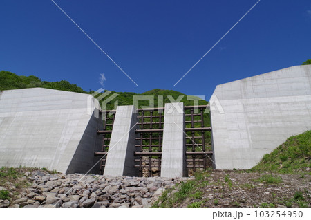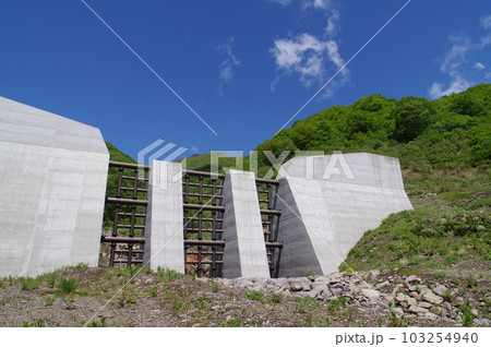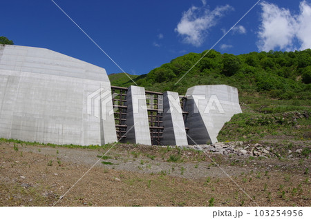信州 小谷村の砂防施設 栂池沢3号砂防堰堤 鋼製スリット3連格子枠の大型堰堤