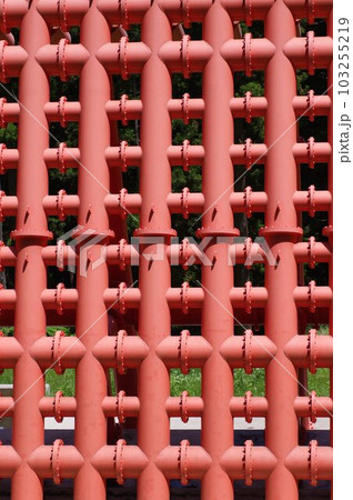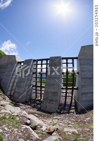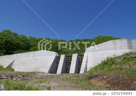 信州 小谷村の砂防施設 ガン沢砂防堰堤 朱色の大規模鋼製スリットが特徴的