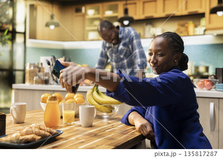 Black smiling young woman taking pictures on her phone and fooling around, enjoying good times and relaxing at home with her boyfriend. Cute girl takes selfies on smartphone over coffee.