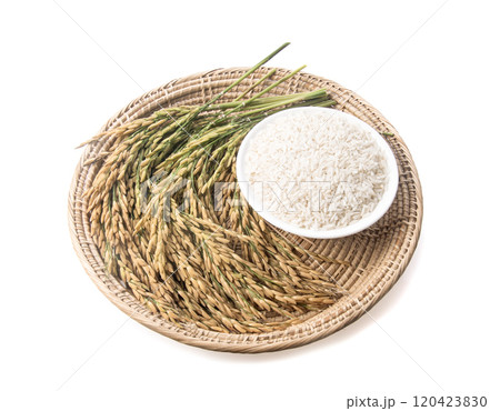 Rice stalks and rice grains on background