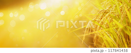 Autumn sunlight golden rice ears and paddy field landscape background, rice harvest and good harvest concept