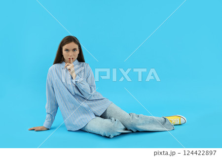 Attractive young girl sitting on a blue background