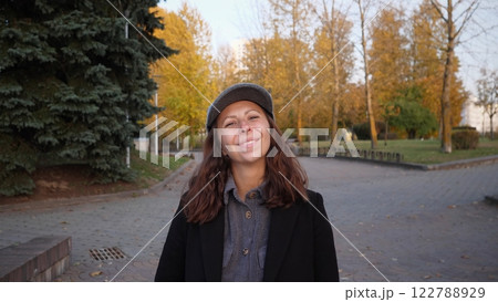 Portrait of a beautiful happy woman in spring in a city park