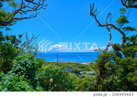 千葉県館山市の御手洗山の洲崎神社の拝殿付近から伊豆大島を見る