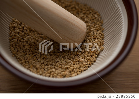 すり鉢と白ごま、すり胡麻。小さいサイズのすり鉢と擂粉木、白ごま(炒りごま)です。ゴマは擦っています。