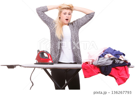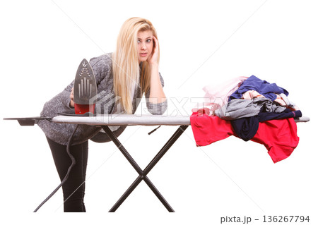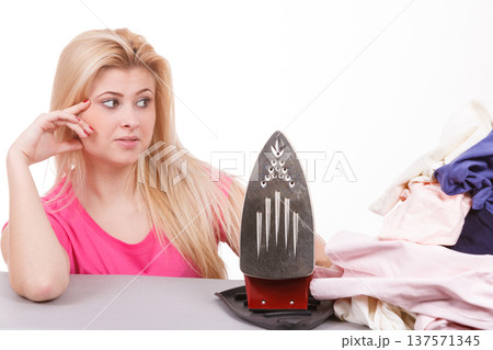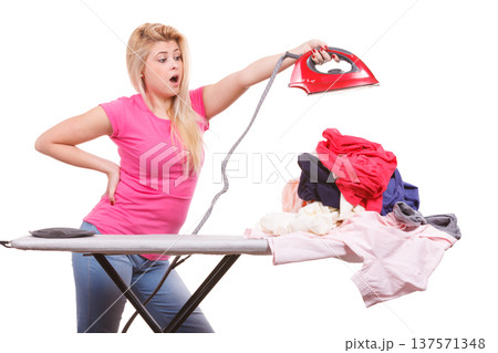 Woman holding iron about to do ironing
