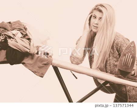 Tired woman yawning while doing ironing