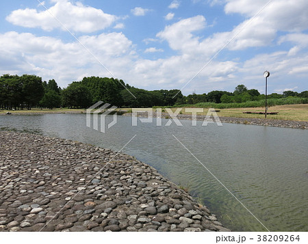 わき水広場の水辺 野川沿い 野川公園横 秋晴れの青空 東京都三鷹市大沢