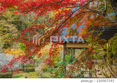 神奈川県立七沢森林公園 せせらぎ広場の寸草亭と紅葉