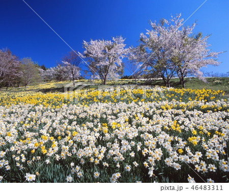 北海道せたな町北桧山区玉川公園の満開の水仙の丘の風景を撮影