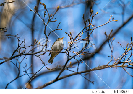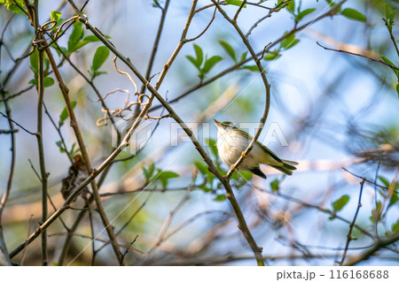 樹の枝にとまってあたりの様子を伺っているセンダイムシクイ
