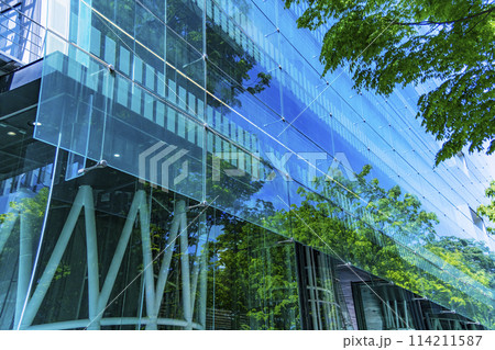 緑の木々に囲まれたガラス張りのビルの都市風景