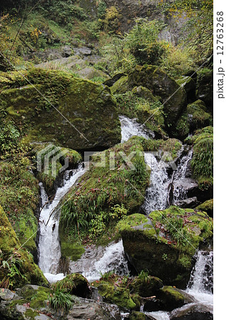 渓谷 秋の紅葉に映える(五家荘・せんだん轟の滝)周辺の紅葉に染まる景色「熊本県八代市泉町柿迫」