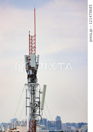 A tall modern communications tower, A signal modern tower with clear blue sky background