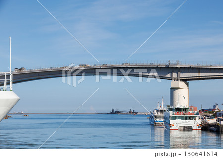 慶良間諸島の座間味島等へゆく高速ジェットフェリー。 クイーンざまみ3号。 奥には泊大橋が見える。