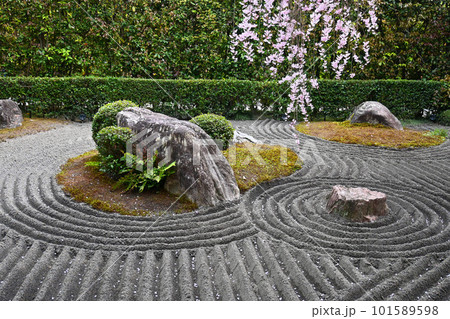 春の京都市退蔵院 枯山水 陽の庭と枝垂れ桜