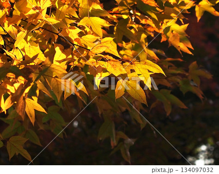 秋の日差しを浴びた黄色いカエデの葉っぱ(黄葉した台湾楓)