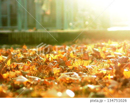 朝の日差しを浴びた冬の芝とカエデの落ち葉(公園広場の台湾楓の樹の下で)