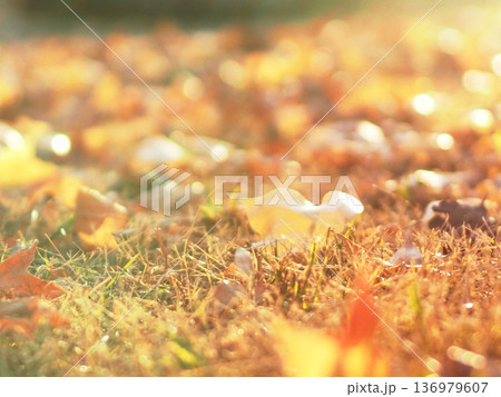 朝の日差しを浴びたカエデの落ち葉(霜が降りた台湾楓の落葉)