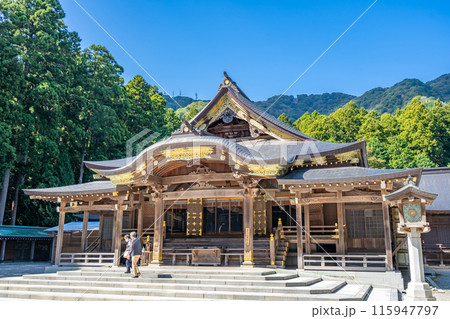 越後一宮 彌彦神社 御本殿・拝殿 三間社流造向拝付 弥彦山を背景に深い杜の境内