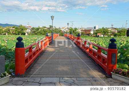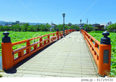 【新潟県上越市】高田城址公園の蓮と外堀の赤い橋