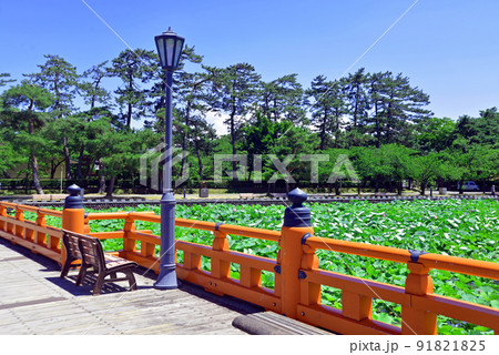 【新潟県上越市】高田城址公園の蓮と外堀の赤い橋とベンチ