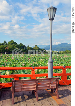 【新潟県上越市】高田城址公園の蓮と外堀の赤い橋tとベンチ