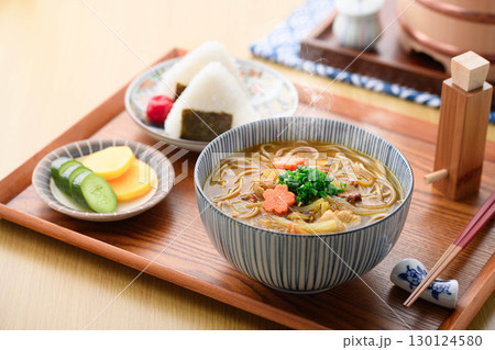 熱々カレー蕎麦とおにぎり定食の和食シーン 湯気立つ麺料理と漬物の食卓イメージ