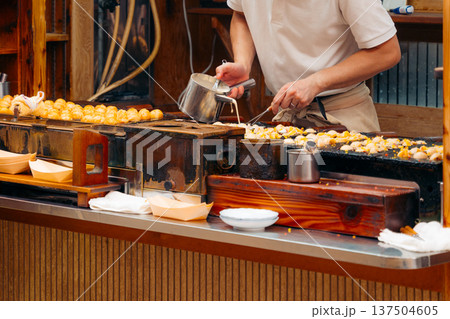 Osaka chef prepares takoyaki, a popular Japanese street food snack