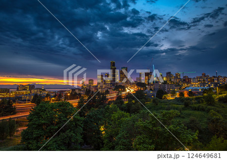 Nightfall Over Seattle Skyline with traffic on the I-5 freeway