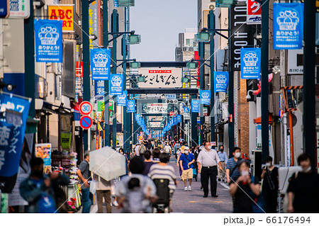 日本の東京都市景観 「東京アラート」発動中で、マスク姿が目立つ戸越銀座商店街