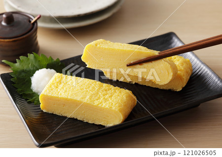 Tamagoyaki, a Japanese omelette made by rolling together several layers of fried beaten eggs, served on a plate.