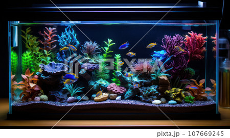 Fish swim in a blue neon aquarium