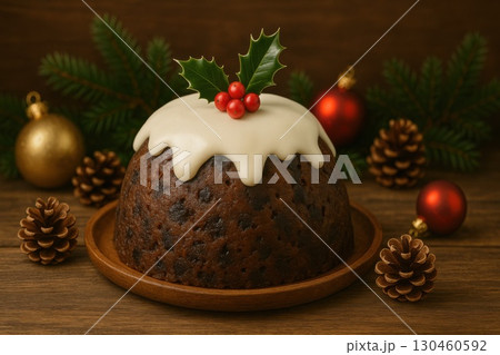 Festive Traditional Christmas Pudding with Icing and Holly Berries on Wooden Table Holiday Dessert Scene