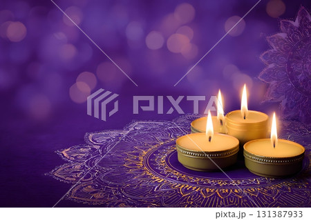 Traditional ornate oil lamp glows amid golden embroidery and Arabic calligraphy. Cultural and spiritual ambiance with luxurious decoration. Generative AI.
