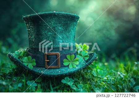 vibrant green leprechaun hat adorned with clovers, symbolizing luck and celebration. Perfect for St. Patrick Day festivities