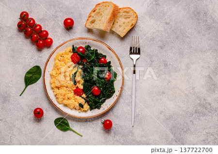Cooked omelette and spinach with tomatoes on a light background