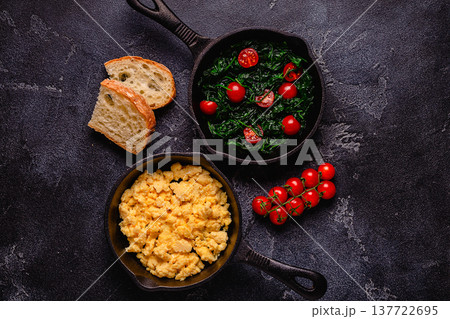 Cooked omelet and spinach with tomatoes in pans