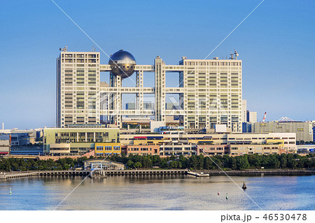 お台場海浜公園の前に立つアクアシティとランドマークとなったフジテレビ本社の巨大なFCGビル。